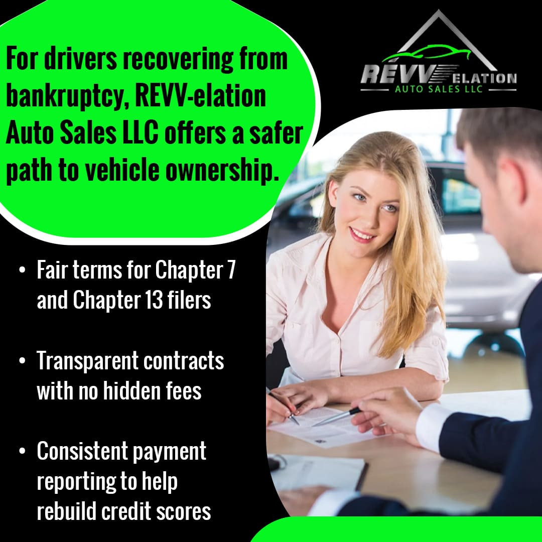 At REVV-elation Auto Sales LLC, drivers in Houston, TX, gain access to financing solutions designed for recovery, not risk. As a trusted post-bankruptcy car dealership, the company focuses on safe and transparent loan options that help customers rebuild credit while securing reliable transportation.